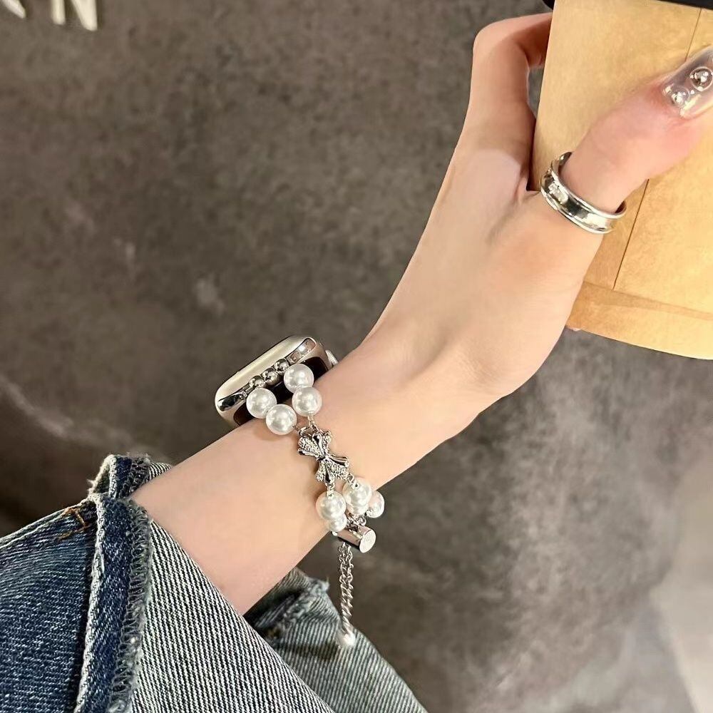 Apple watch ribbon stainless bracelet band /リボンパールチェーンアップルウォッチ ハートビジュー y2k ステンレスベルトバンド 秋冬 オシャレアップルウォッチバンド y2k おしゃれ かわいい メンズ ユニセックス LL25111401
