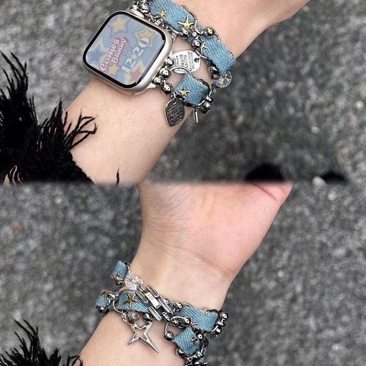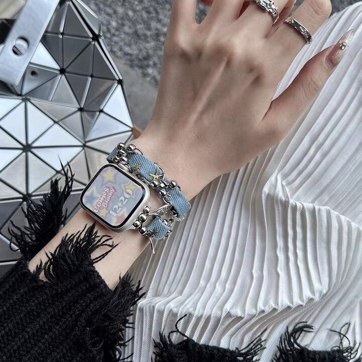 Apple watch double denim bracelet band /ダブルデニムチェーンアップルウォッチ ハートビジュー y2k ステンレスベルトバンド 秋冬 オシャレアップルウォッチバンド y2k おしゃれ かわいい メンズ ユニセックス LL25112201