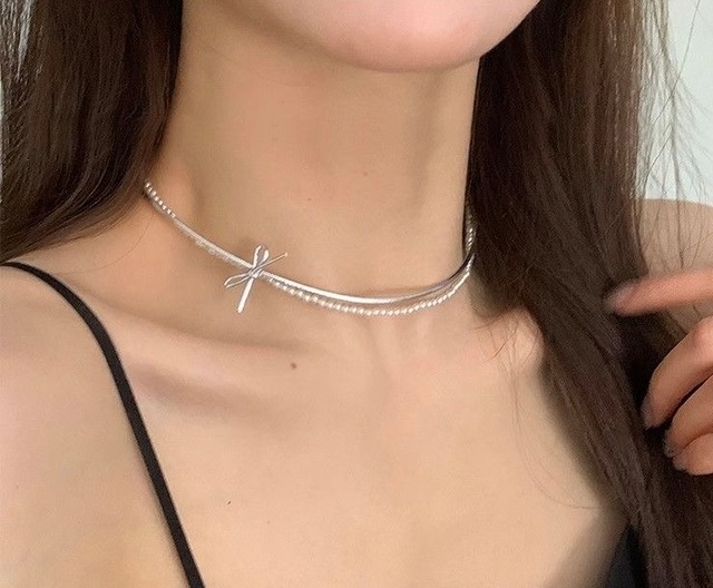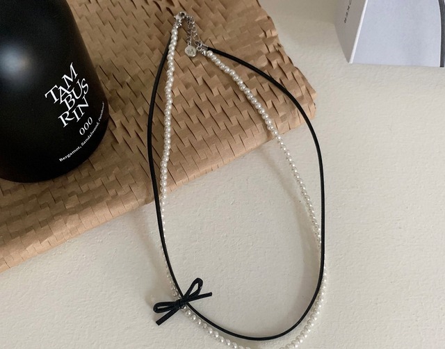 pearl ribbon neckless/パールリボンレザー風ネックレス 韓国アクセ y2kアクセサリー おしゃれネックレス LL24072601